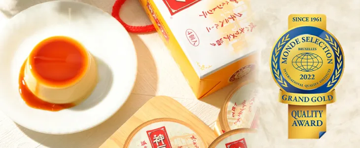 「神戸の街にふさわしいおいしいお土産を作りたい」そんな熱い想いと共に3年間の試行錯誤を重ね完成した神戸プリン…素材の組み合わせはシンプルですが、そのぶん素材の風味や丁寧な製法が生きる一品です。1993年に誕生以来、多くの皆さまに愛されています。