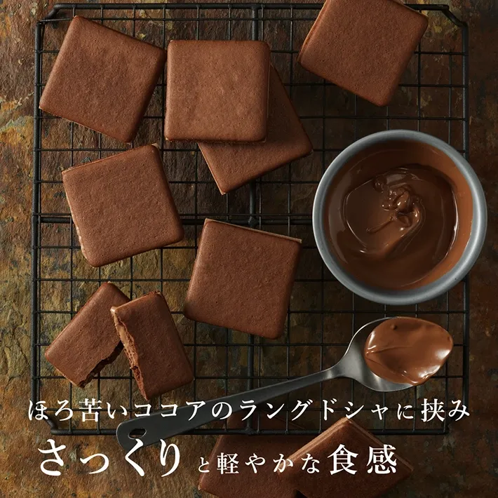 人気の神戸土産「神戸ミルクチョコラングドシャ」。さくさく香ばしいチョレートクッキーにほんのり甘いミルクチョコをサンド!!一度食べたらやみつきです。コンディトライ神戸のロングセラー人気商品。ほろにがいチョコレート生地のクッキーにまろやかな甘さのミルクチョコレートを余すところなくサンドした、本物の美味しさのラングドシャは女性に大人気!当通販サイトにて好評販売中!