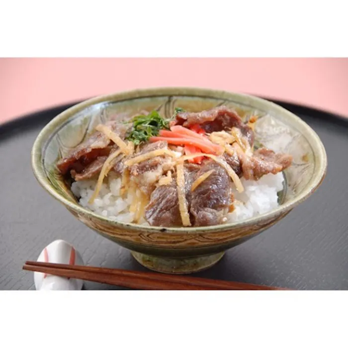 国産牛肉、しょうが、ごぼうをじっくりと甘辛く炊き上げました。薄切りになっておりますので、袋のまま、熱湯で3分温めたあと丼に盛られたご飯の上にかければ、簡単に牛丼が出来上がります。