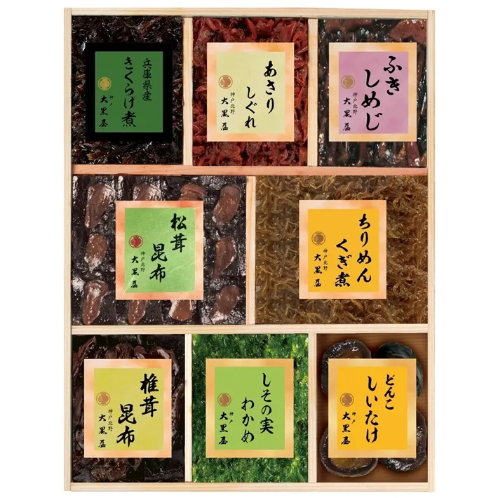 神戸北野 大黒屋がお届けする至極の佃煮詰合せ「味彩心」シリーズは、あっさりと炊き上げた山椒の風味さわやかなちりめん山椒、塩分控えめ松茸昆布、椎茸昆布、どんこしいたけ、ふき・しめじ・昆布・山椒等をほどよく混ぜて炊きましたふきしめじ、兵庫県産のきくらげ煮、おつまみにもなる甘口のあさりしぐれ、しその実わかめの8種類の詰合せです。 ご飯にとてもよく合う佃煮を詰合せました。 ぜひご賞味下さい。お中元・お歳暮のシーズンにはご利用頻度も高くなる贈答品人気アイテムです。