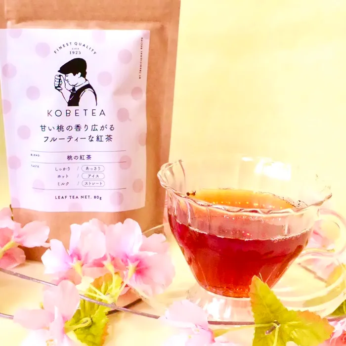 神戸紅茶の紅茶鑑定士セレクションリーフシリーズ。桃の紅茶は渋みが少なく飲みやすい茶葉に桃の香りをつけました。甘い桃の香りが広がるフルーティーな紅茶です。 紅茶鑑定士の「検茶の様子」をテーマにデザインされたパッケージ。 一見水玉模様にも見えますが、紅茶鑑定士が検茶の時に使用する茶器をイメージしています。ひとつだけ形の違う検茶カップが隠れています。今までの神戸紅茶にはなかった、とても可愛い&おしゃれなパッケージに仕上がっています。 人気の神戸紅茶はおみやげギフトシーブランド神戸の通販サイトにて絶賛販売中です!