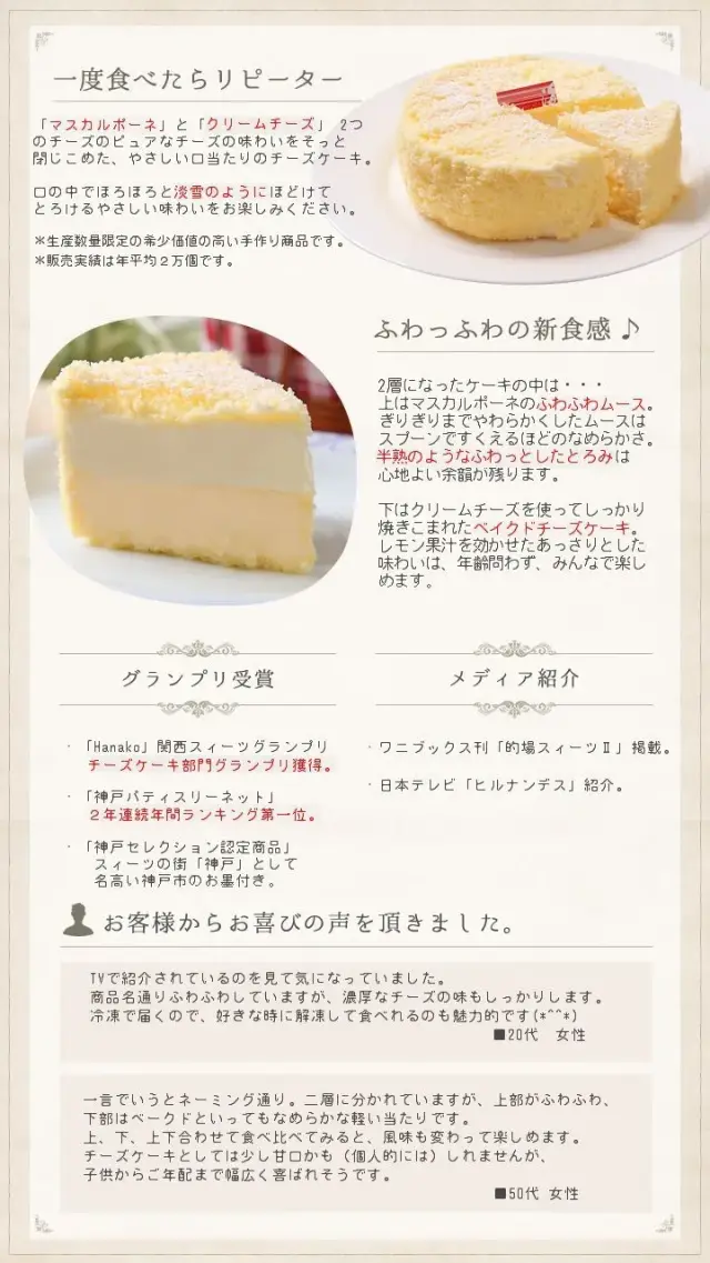 神戸で今大注目の洋菓子店「コンサクレカイ」の大ヒット商品!「一度食べればリピーター」のキャッチフレーズ通りの美味しさ!1年間に2万個の販売実績を誇る本格チーズケーキです。口の中でほろほろと淡雪のようにほどけて、とろけるチーズケーキのやさしい味わいをお楽しみください。ベイクドチーズとチーズムースの2層が淡雪のようにほどけて、とろける美味しさ!上はたっぷり空気を含んだやわらかいマスカルポーネムース、下はどっしり、でも後味すっきりなベイクドチーズ層です。ホワイトデーのお返しや母の日、父の日のギフトに。また敬老の日やクリスマスのプレゼントになどいろいろなイベント行事でお使い頂ける、おすすめの神戸スイーツ。