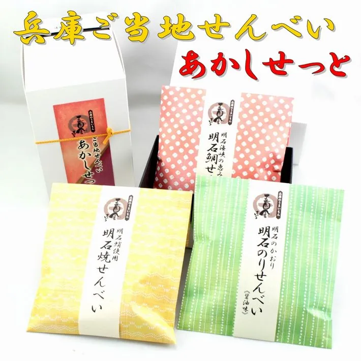 兵庫のうまいもんご当地せんべい 「あかしせっと」は、兵庫明石の地元の食材を取り込んで作られた、まさにご当地限定のお煎餅です。関西土産 和菓子部門でも今注目の逸品です。明石焼・明石のり・明石鯛・・それぞれにしっかりと個性を持った味わいは、どなた様にも楽しんでいただけるお煎餅です。専用のギフトBOXにお入れしてお届けします!人気の和菓子詰合せギフトは、御中元やお歳暮のギフトとして、また敬老のプレゼントに。お盆時期の御供としても。あらゆるギフトシーンでご利用頂けます。おみやげギフトシーブランド神戸の通販サイトにて好評販売中です。
