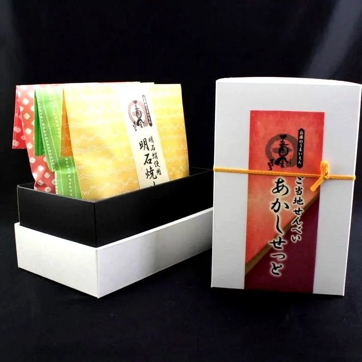 地元兵庫「明石」にゆかりのある、明石焼き・明石鯛・明石海苔という食材をぎゅぎゅとお煎餅に。個性豊かな味わいがついついクセになる!?そんな和菓子を高級ギフトBOXに詰め合わせました。ご贈答にお勧めな逸品です!
