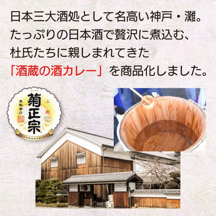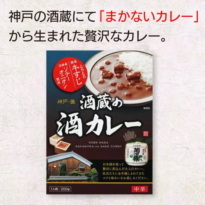 菊正宗の酒蔵「嘉宝蔵(かほうぐら)」では冬の半年間、丹波杜氏たちが住み込みで酒造りに励んでいます。 厳しい作業に追われる杜氏たちの楽しみはやはり食事。中でも人気のメニューがまかないカレーです。その特徴は煮込む時に絶妙の塩梅で日本酒を入れること。 コクと旨みがたっぷりの酒蔵ならではの味わいです。 そんな杜氏たちに親しまれてきた、酒蔵のまかないカレーを皆様に味わってもらいたい、という思いから「酒蔵の酒カレー」を商品化しました。 日本酒で贅沢に煮込んでいるほか、地元神戸らしく、具材に国産牛のすじ肉とこんにゃくを使用。コクと旨み、そして爽やかな辛さのある大人のカレーに仕上がっています。 酒蔵ならではのちょっと贅沢なカレーを是非お楽しみください。 そんな作り手の思いの詰まったご当地カレーは、 おみやげギフトシーブランド神戸の通販サイトにて大好評販売中です!